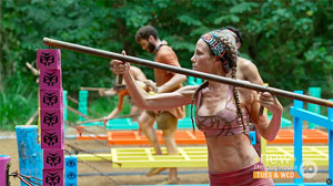 Zara sits out. Two people (Laura D, Ally; Kristin, Kate) make a fire on one end of a see-saw. Meanwhile, the rest must solve a cube puzzle, then climb the puzzle to retrieve a key, to unlock a net that they carry through the course to collect coconuts. Finally they pass the coconuts to the top of a tower, where two people (Karin, AJ; PD, Ben) toss them down into a barrel on the non-fire end of the seesaw, eventually raising the fire to burn through a flag. First tribe to do so wins immunity. Results: Brains have a big lead, but Ally and Laura haven't started the fire by the time they're ready to drop the coconuts. Brawn tosses first, wins. Brains never toss.