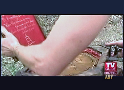 of red crew people digging up the treasure, and Ben can be seen behind Sean when