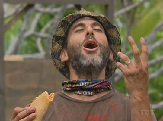Obviously, the decision (made mostly by Penner, but strongly supported by Ozzy) not to share Penner's fish with the lackadaisical Raro Three of Candice, Adam, and Parvati, was one of the major events here. But was it really that bad, considering that just three days earlier, they'd admitted among themselves that they sort of enjoyed laying around, forcing Penner to feed them in order to maintain his place in the game. So when the merge reversed that power relationship, all of a sudden it's Penner who's revealing his true colors, and an arrogant rat? Really, if the Raros were so hurt by Jonathan not sharing his fish, why didn't they just catch some of their own? Oh, right. Because Parvati has barely even bothered to watch someone gut a fish, let alone catch one.