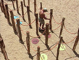 Rodger sits out. Each tribe has one sighted caller (Jerri, Nick) who directs pair of blindfolded tribemates (Colby-Tina, Amber-Keith; Alicia-Jeff, Elisabeth-Skupin) through a series of tasks: put two logs on a trestle, replace a fish trap, fill a bucket, move a picnic basket to a picnic table. Amber has Ogakor's picnic basket, but Jerri can't direct her quickly enough, and Kucha swoops in for a come-from-behind victory. Kucha wins a Doritos and Mt. Dew picnic. |