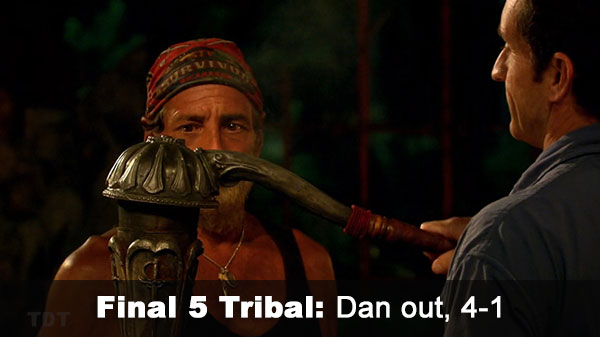 - Ep.14 F5 Tribal: Fabio and Dan try to convince Sash that Holly is a much bigger jury threat than Dan is, but Sash declines to join them. So Dan is out, 4-1 over Chase.