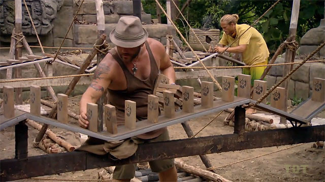 Contestants must do a giant staircase puzzle (with three sets of planks), one plank at a time. Rob wins, after 'literally carrying his family on his back.' TC14 - Andrea voted out (5-1), goes to R.I., 5 left. |