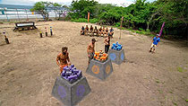 Tribes must slide four heavy blocks along a rail to form a staircase. They run up the stairs to a platform, where one person (Matt, Ralph) chops through ropes, releasing a second set of stairs. After climbing the stairs, they assemble a large pyramid-shaped block puzzle. Zapatera wins immunity and flint. TC1 - Francesca voted out (4-3-2), goes to Redemption Island; 17 left. |