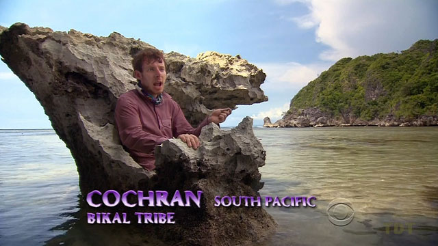 Speaking of apologies, I should say here that I'm not sure how we've gotten so far into this season with so little presence of Cochran, who was one of our absolute favorites going in. We were hoping for the same, paranoid, neurotic kid we had on South Pacific, but instead he's been a lot more calm and confident this time around. How are we supposed to point and laugh at the nerd, if he's comfortably ensconced in the dominant alliance? Best laid plans. So anyway, to remedy this, we found this great rock in which we forced him to do his confessional interviews. He resisted at first, muttering something about being a grown man, and not our poseable Ken's Ectomorphic Cousin Who Went to Law School doll. But in the end, he gave in when we told him we could completely edit him out of the show, like we did with that cowboy guy he appeared with last time. That got him moving.