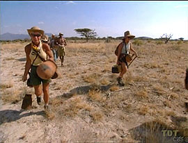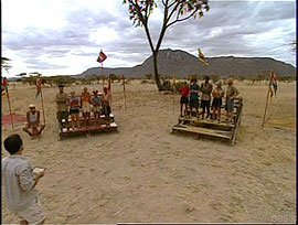 Carl and Teresa sit out. As in Borneo, both tribes are instructed to make a distress signal that can be seen from a plane passing overhead. Samburu spells SOS using their boma as the O. Boran chooses a large open area for theirs, and adds mosquito nets dyed using Mama Kim's luxury item, acrylic paint. Boran's effort is judged much more eye-catching, and they win immunity. |