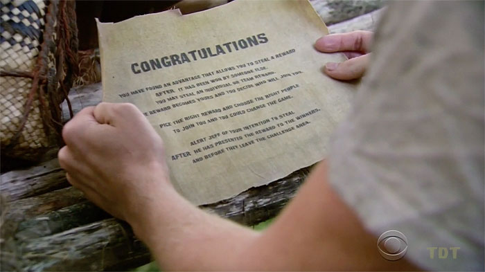It's sort of hilarious that the "reward steal advantage" was somewhat difficult to find. (There was actually a coded clue for it in the reward chest, which was obviously a waste of time, since Adam skipped right past that step and just looked in a likely spot.) That's because this alleged advantage is actually the equivalent of Brenda's crappy choice at the Loved Ones visit in Caramoan. Alternatively, t's the exact opposite of everyone (including the winner) voluntarily swapping out to give others their rewards in San Juan del Sur. Its only seeming value is to make the other recent advantages (Dan Foley's and Stephen Fishbach's extra votes) seem actually somewhat advantageous by comparison.
