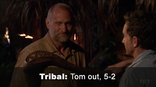 - Tom received 5 votes, from Aaron, Elaine, Elizabeth, Karishma, Missy, and Tom (voted out, 6-2).