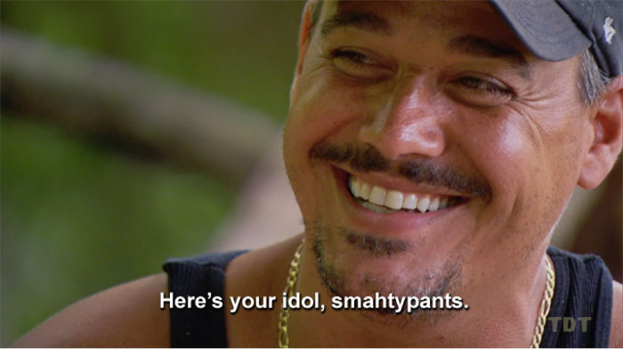 I feel like I’m going to end up using that screenshot every single week questioning how much these “tests” actually help the players understand the game better. The first question couldn’t have been easier — what branch of the military did Sandra’s husband serve? Hmm, that had to have been a toughie because surely the ARMY hat Sandra was wearing wasn’t a hint. Kellee, of course, got the question right and proceeded to get the next two (admittedly a tiny bit more challenging) right as well to win an idol. I shudder to think of what questions 4 and 5 may have been though. “Does Sandra wear glasses?” or “What city does Rob get his nickname ‘Boston Rob’ from?”
