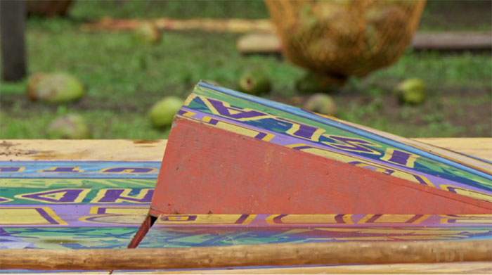 Janet was “randomly” selected to be the next to visit the Island of the Idols where she’d find Boston Rob and a busted-up Sandra. Clearly, the construction of their shelter outside the snug was not easy work.