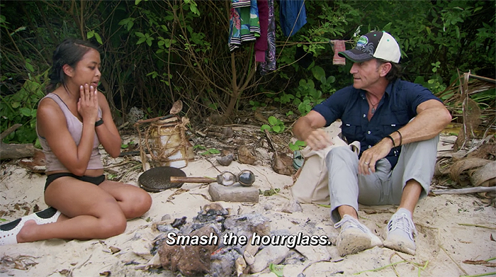 Similarly, Erika's "choice" to smash the hourglass wasn't even a choice, as fans pointed out immediately when Probst presented the options to her last week. If she opted *not* to smash the hourglass, she would have to compete in the individual IC the next day, and if she lost, she would have a few hours to catch up on the two days of merge tribe plotting she'd missed. That would be suicidal, game-wise. But if she *did* break the hourglass, she doesn't have to compete in the IC, earns the goodwill of the team that didn't send her to Exile, gets to slap back at the team that did, AND she receives immunity, a free pass at the first post-merge Tribal. Such a Sophie's choice dilemma!