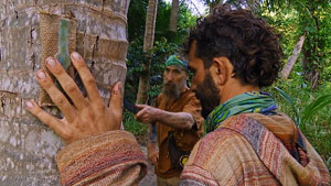 Shortly before Tribal Council, Cody goes looking for idols. After looking in many places, he finds a Beware idol package just sitting on a stump. Being Cody, he opens it immediately, without considering the risk. The new rules require him to acquire a specific bead from each member of his tribe, or he loses his vote, and the idol is inactive. He enlists Jesse's help, who directs him to pretend the beads are for decorating his hat. The scheme works, and Cody recovers his vote, and has an active idol. TC2 - Justine voted out (3-1-1), 16 left. |