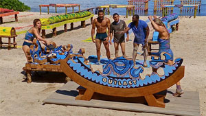 Karla, Noelle sit out. As seen in Game Changers. Five contestants must dive off a dock, swim to and climb over to enter a cage, then untie a 400-lb snake, haul it over the side of the cage, to the shore, and up the beach to a platform. There, they untie knots and remove six discs, three of which contain the combination to a lock. One person unlocks it, release a puzzle bag, which contains a puzzle piece two people (Dwight, Nneka; Jeanine, Elie; Cassidy, Lindsay) must use to complete a logo puzzle. Winner gets fishing gear kit, second place gets mask, snorkel, fins. Baka wins, Coco is second. Vesi is very slow moving the snake, loses.