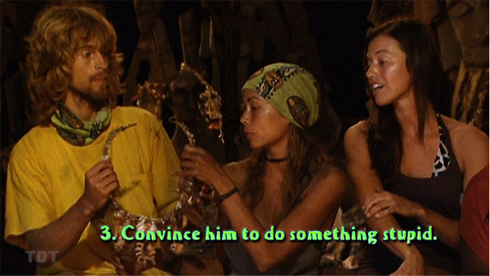 More analogies to work through at tribal council including Gabler (not a doctor) giving us an assessment at where the game’s at in terms of heart surgery, buying a car, calling everyone assassins, and Jeff talking about ducks being on auto-pilot on top but full speed ahead on bottom – I guess all ducks are power bottoms. Thanks for the biology lesson, Jeff.