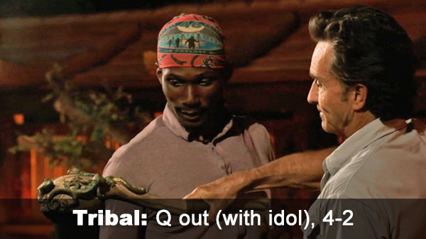 - Ep.12 Tribal: Fourth straight Tribal with an idol-holder voted out while holding their idol, as Q is out, 4-2 over Charlie.