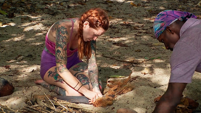 Tiffany: “Why is this rain coming through the tarp?” Could it be because you put it on top of the palm fronds instead of under it? I’m no camping expert, but that just didn’t make sense to me.