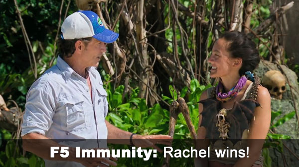 - Challenge scoring: Rachel was clearly second in the F6 IC, and everyone else (except Genevieve) tied for 3rd. In the F5 (stacking) IC, Genevieve's last-second collapse proved there's no guarantee that placements will hold, so everyone except Rachel tied for second.