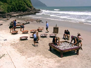Shii Ann sits out. One person (Helen, Penny) launches wicker balls from a giant slingshot, while the other four are stationed on the beach with wicker baskets on poles, next to one person from the other tribe. Their goal is to catch the launched ball, while preventing their opponent from doing so. First tribe to five catches wins a fancy Thai reward feast on the beach, with music and dancers. Catches: Robb-1 (SJ1), Ted-1 (CG1), Robb-2 (SJ2), Robb-3 (SJ3), Robb-4 (SJ4). [CG calls time out, has Ted guard Robb] Clay-1 (CG2), Brian-1 (CG3), Ted-2 (CG4), Ken-1 (SJ5). Sook Jai wins!