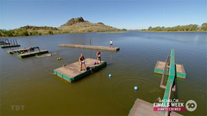 Contestants must run out into the water, retrieve a bag, bring it back, tie sticks together to form a pole to retrieve a key, use the key to unlock sandbags. They must then land 5 sandbags in a spinning goal. First to do so wins an overnight stay at the Tylenol Outback Retreat. Order to sandbags: Hayley, Flick, Dani (George gives up). Sandbags landed: Hayley-1, Flick-1, Dani-3, Hayley-2, Flick-2, Dani-4, Dani-5. Dani wins! She takes Flick, Hayley with her. |