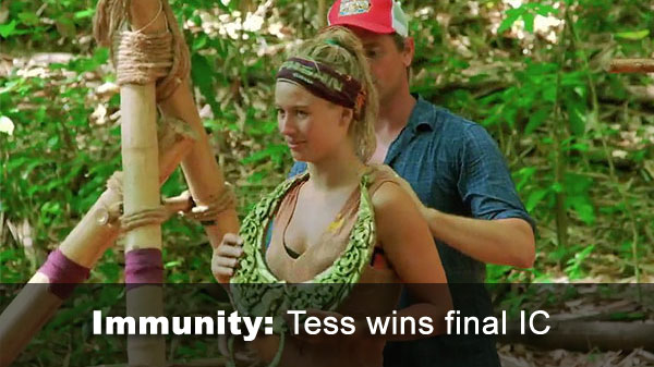 Overall scores note: Tess's scores (relative to Lisa's and Dave's) really reflect the divergence in preference between SurvSc and SurvAv. SurvSc rewards voting people out, votes against are not a big deal, and challenges are a minor component. For SurvAv, voting people out and receiving votes are both important, but a lot of individual challenge wins can elevate your score. Tess leads in SurvAv, due to three individual challenge wins (vs. two for Dave, zero for Lisa). Dave and Lisa have both voted a lot of people out, though, and have nearly double Tess's SurvSc totals. Perhaps something in the middle would be the best gauge?